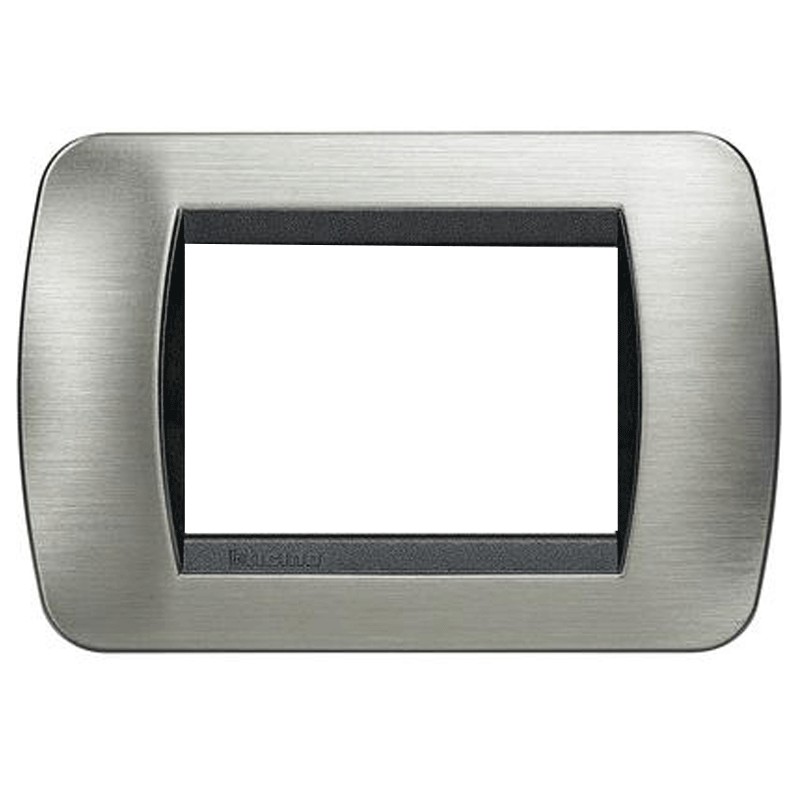 Plaque Bticino LivingLight (ex international) 3 modules (fruits, lieux) couleur acier brossé. La plaque peut être montée sur le support L4703 (ancien modèle hors production) et LN4703.