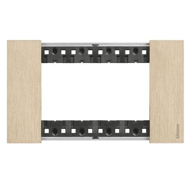 Plaque Bticino Living Now 4 places couleur Or. A appliquer uniquement sur le support K4704, matériau : zama, dimensions hauteur 86 - largeur 147.5.