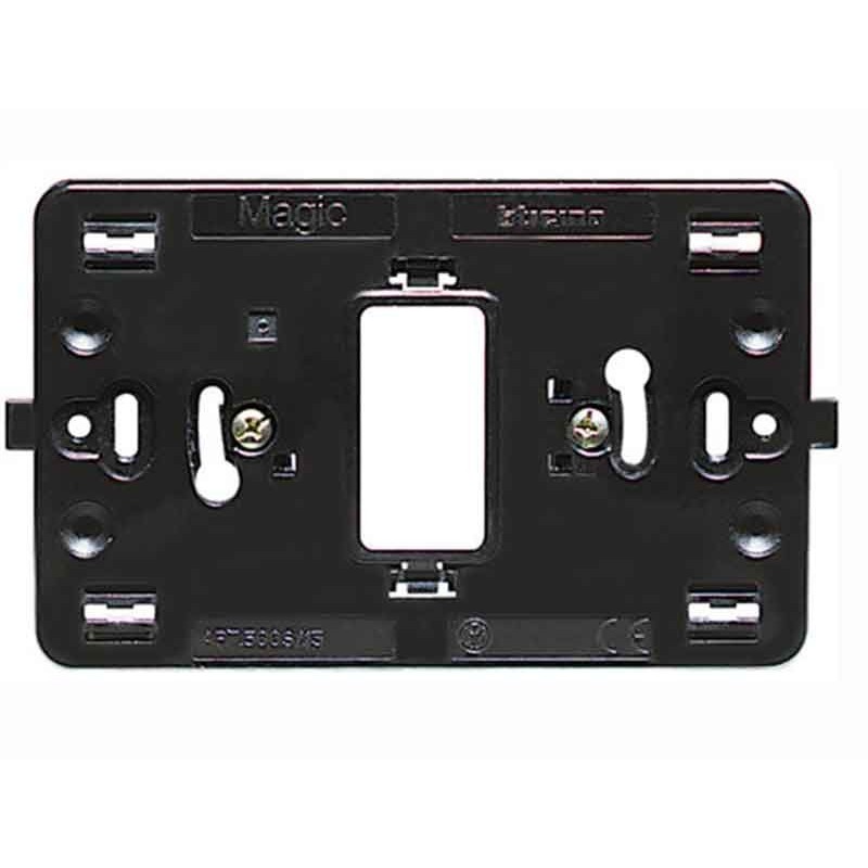 Support 1 place (module) Bticino Magic. Peut être fixé avec des agrafes ou des vis, prévoit le montage sur la boîte encastrée ronde ou carrée.