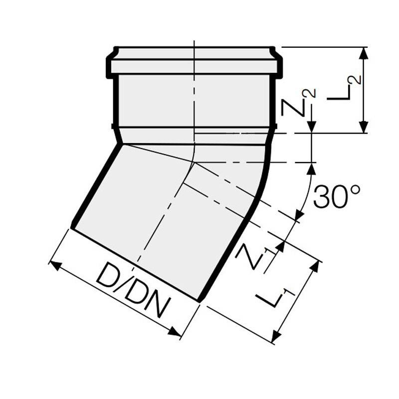 Coude 30 degrés pour tuyaux d'évacuation insonorisant en PP polypropylène Valsir PP3 à emboiture avec les caractéristiques suivantes :