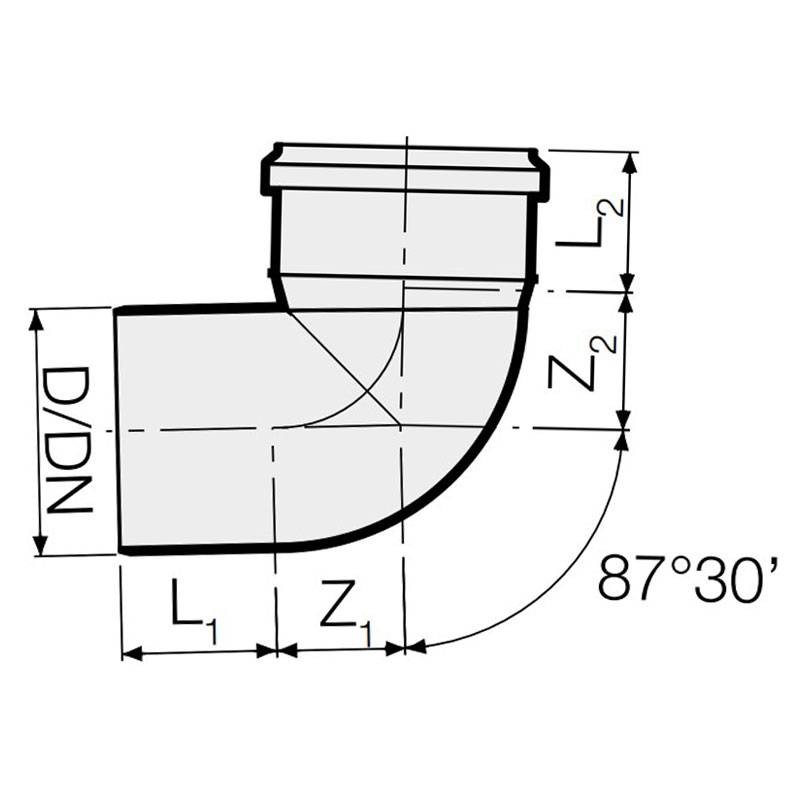Coude 87 degrés 30’ pour tuyaux d'évacuation insonorisant en PP polypropylène Valsir PP3 à emboiture avec les caractéristiques suivantes :