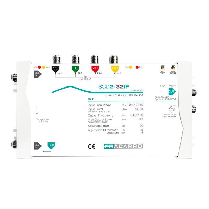 Unité de contrôle Fracarro IF-IF modèle SCD2-32IF SSA 4 entrées satellite et 2 extensions 1OUT avec les caractéristiques suivantes :