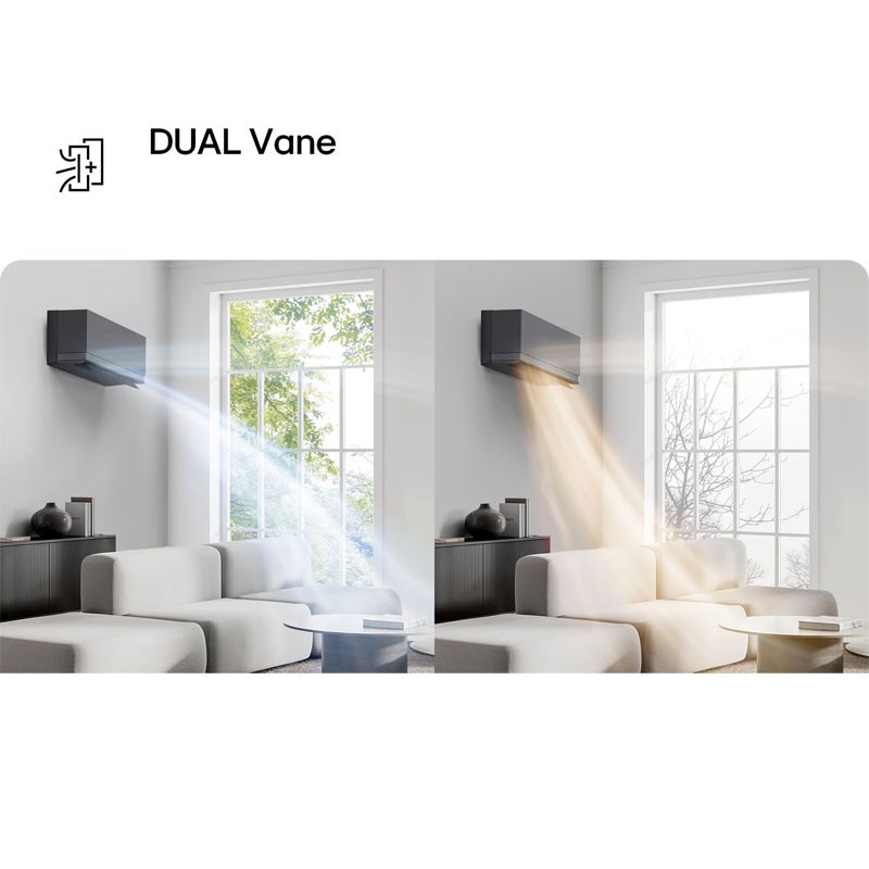 - DUAL VANE : direction optimale du flux d'air, confort à toute température grâce au déflecteur inférieur qui distribue le flux vers le haut ou vers le bas, loin et rapidement, en fonction du mode de fonctionnement.