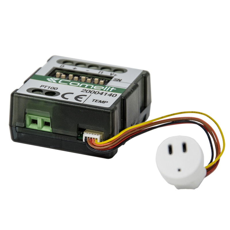 Module encastrable SimpleHome avec une entrée pour la connexion d'une sonde de température et d'humidité Comelit (incluse dans le pack), une entrée pour les sondes de température PT100 standard (non incluses dans le pack) et une entrée numérique pour la connexion d'un contact de fenêtre ou d'un bouton de commande. Le module permet d'utiliser la sonde de température Comelit ou la sonde PT100 pour mesurer la température et l'humidité (sonde Comelit uniquement) dans la pièce et pour contrôler les systèmes de chauffage, de refroidissement, de VMC même à plusieurs vitesses (ventilo-convecteur, VMC, etc.) via des sorties relais ou une sortie analogique 0-10 V. Il comprend une fonction de contrôle du point de rosée. Il comprend une fonction de contrôle du point de rosée pour éviter la condensation sur le sol. L'entrée PT100 peut être utilisée en complément du capteur Comelit pour mesurer la température du sol et calculer ainsi le point de rosée avec précision ou pour éviter d'endommager le sol en cas de surchauffe. Le capteur de température et d'humidité Comelit peut être installé sur n'importe quelle série civile en appliquant un petit trou sur une plaque de recouvrement. Consommation de courant maximale : 5mA.