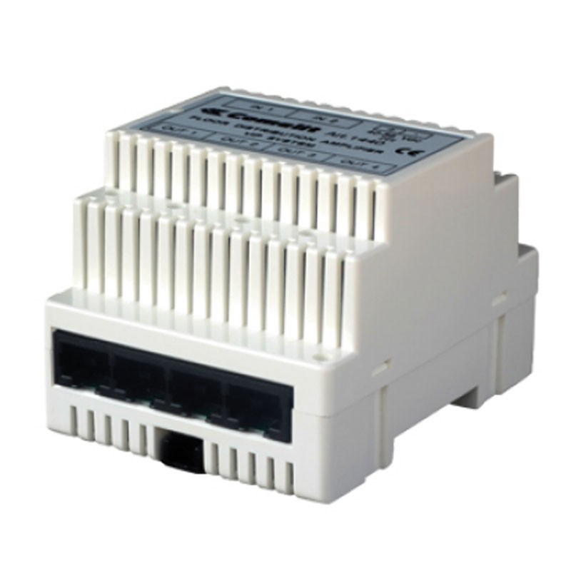 Distributeur d'étage IP (VIP) 1440 : Distributeur d'étage avec une entrée, une sortie (10/100Mbit/s) et 4 prises (10 Mbit/s). Dimensions : 71x89x62 mm (4 modules DIN).