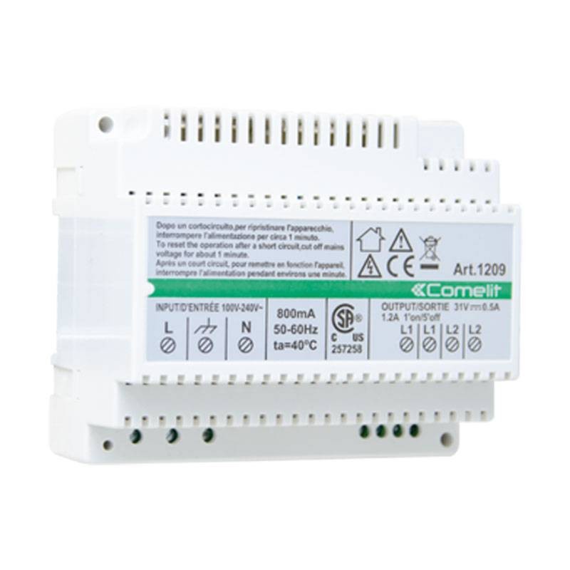 Bloc d'alimentation 33 VDC pour KIT Simplebus 2 auquel le bloc-porte et le poste d'appartement peuvent être directement raccordés. Équipé d'une protection contre les surcharges et les courts-circuits. Tension d'entrée 110-240 VAC. Dimensions : 106 x 62 x 89 mm (6 modules DIN).