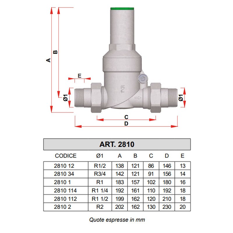 - Réducteur de pression pour installations sanitaires, en laiton CR chromé, avec raccords union mâles 1/2-3/4-1-11/4- 11/2- 2, cartouche filtrante inspectable et remplaçable, raccord manomètre, clé de réglage en plastique, joints toriques et joints d'étanchéité en EPDM, siège d'étanchéité en acier inoxydable. Fluides utilisables : air et eau. Température maximale d'utilisation 75°C. Pression nominale 25 bar. Pression aval réglable : 1 à 6 bar.