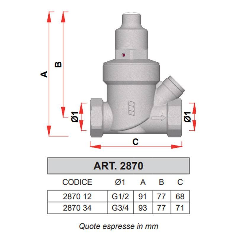 Réducteur de pression Far 2870, pour installations sanitaires avec raccords femelle-femelle et raccord pour manomètre :