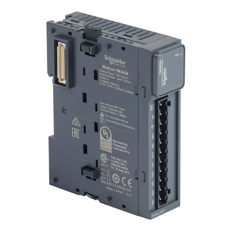 Le module de sortie analogique fournit 4 sorties avec un signal de 11 bits + et une résolution de 12 bits. C'est un module de sortie avec une tension d'alimentation nominale de 24V DC et une consommation de courant de 125 mA à 24V DC via une alimentation externe à pleine charge. Le produit peut commander des variateurs de vitesse ou tout autre dispositif doté d'une entrée de courant ou de tension.