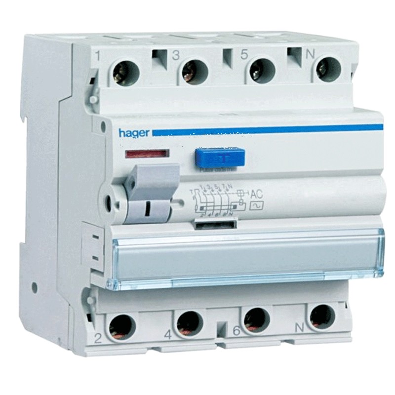 Interrupteur différentiel pur Hager, 4 modules, prise DIN (universel pour tout central), 4P pôles, position neutre à droite, 40 ampères, courant différentiel Idn 300mA, tension 230/400 Vac, type différentiel AC.