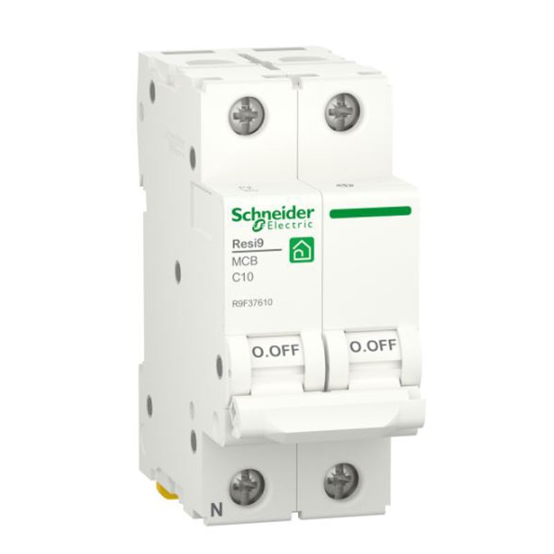Schneider Resi9 Disjoncteur magnétothermique 10A, pôles 1P+N, pouvoir de coupure 4,5KA C 2 modules, tension d'isolement nominale 440V, prise DIN (universel pour tout coffret électronique), courbe de déclenchement C.
