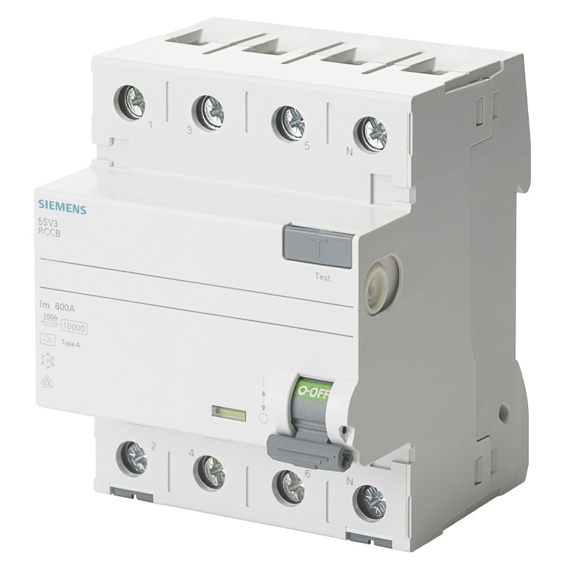 Interrupteur différentiel Siemens, 4 modules, prise DIN (universelle pour n'importe quel central), pôles 4P, 25 ampères, courant différentiel Idn 300mA, tension 500 Vac, différentiel type A.