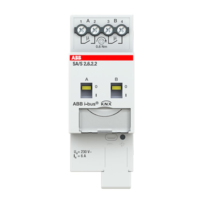 Actionneur de commutation Abb SA/S2.6.2 modules 2 6AMDRC. Utilise des contacts libres de potentiel pour commuter 2 charges électriques indépendantes via ABB i-bus® KNX.