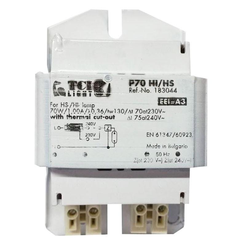 Ballast ferromagnétique TCI modèle P 70 HI-HS pour lampes aux halogénures métalliques (HI) et à vapeur de sodium (HS), avec protection thermique, présentant les caractéristiques suivantes :