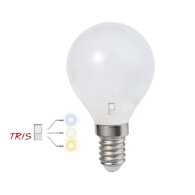 Ampoule à Sphère LED Stone 8W raccord E14, TRILED 3/4/6K avec un simple bouton sur l'ampoule vous pouvez choisir la couleur Chaude, Naturelle ou Froide de la lumière.
