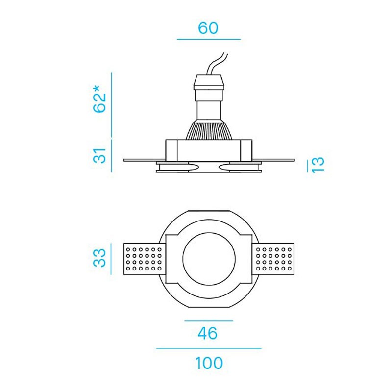 Le corps en plâtre est flanqué d'ailettes en aluminium et de vis en acier qui facilitent l'installation dans les plaques de plâtre et garantissent une tenue durable. La conception compacte, avec une hauteur de seulement 31 mm, convient également aux plafonds de faible épaisseur.