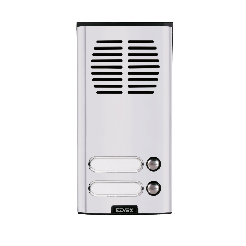 Cette plaque audio murale à 2 boutons est conçue pour les applications d'interphonie résidentielle et de copropriété, même à l'extérieur. Elle se compose d'un cadre en polycarbonate avec protection contre la pluie et d'une plaque de protection en aluminium peint, matériaux choisis pour garantir la résistance aux intempéries et la durabilité.