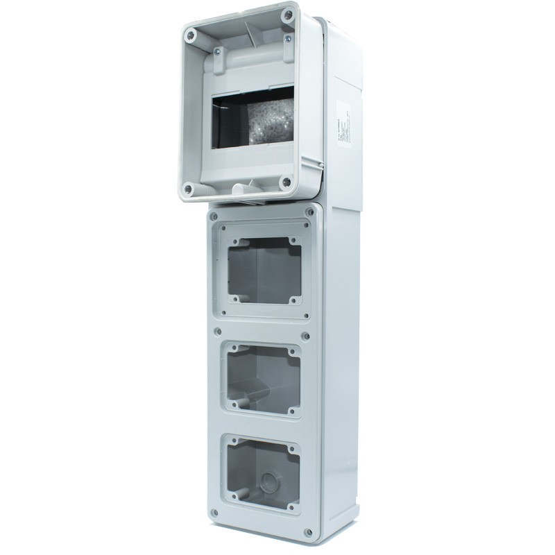 Tableau de chantier Palazzoli avec porte transparente, grande capacité pour l'installation de 3 prises fixes et 5 modules DIN.