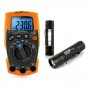 Kit HT composé d'un Multimètre IRONMETER Indestructible TRMS avec lampe de poche LED intégrée. Les mesures de tension AC/DC, courant AC/DC, résistance, test de continuité, la fréquence, la capacité, testeur de diode, le cycle de service, data hold, min/max, autorange, rétro-éclairage, mise HORS tension automatique. et une Pile MINILITE lampe de lumière de travail de faible puissance LED avec faisceau réglable, latéral diffusion de la lumière, rouge clignotant d'urgence, un aimant pour le fixer et le crochet de poche.