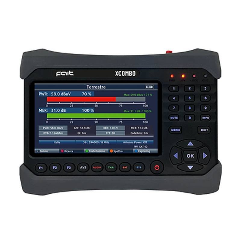 Compteur de signal Fait XCOMBO est un outil professionnel pour l'installation, la configuration et le test des systèmes TV/SAT/FIBRA, compatible avec les dernières normes DVB-T/T2, DVB-S/S2 et HEVC Main 10. Doté d'un écran HD, d'un clavier rétroéclairé et d'un boîtier robuste avec protection en caoutchouc, il offre des mesures complètes, une analyse de spectre et une démodulation vidéo pour garantir une précision maximale dans chaque opération, avec les caractéristiques suivantes