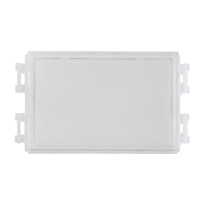 1 Bouton-poussoir simple à double hauteur avec étiquette nominative (DPH 61800040) : Complet avec base et élément de protection externe en polycarbonate transparent résistant aux UV. Dimensions du badge 53x33 mm.