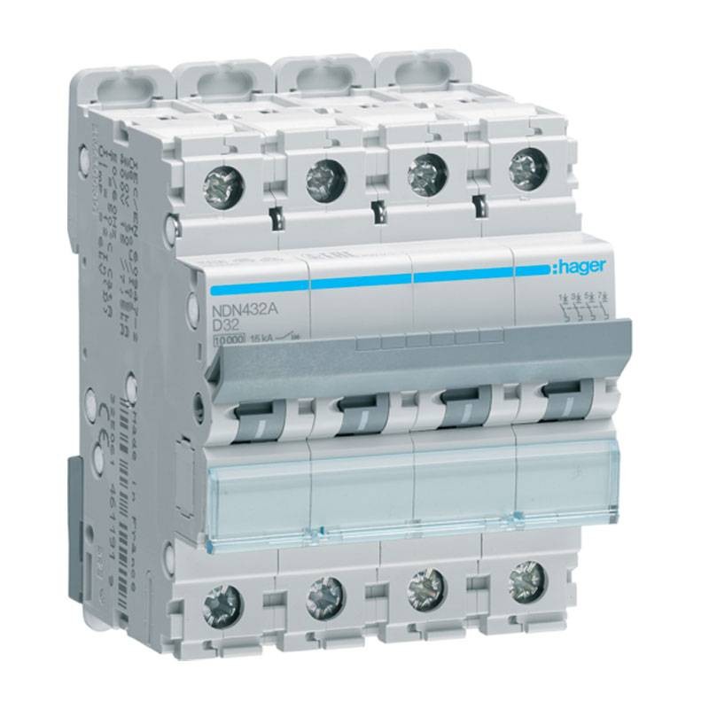 Disjoncteur magnétothermique automatique Hager 4P 32A 10KA courbe D 4M NDN432A