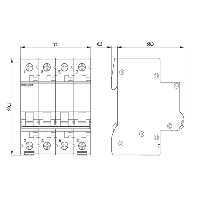 L'interrupteur magnétothermique de Siemens est un dispositif de protection à 4 pôles qui supporte un courant nominal de 63A. Il a un pouvoir de coupure de 10KA, ce qui est idéal pour les circuits avec des charges inductives grâce à sa courbe de déclenchement C, qui se déclenche lorsque le courant dépasse 5 à 10 fois le courant nominal.