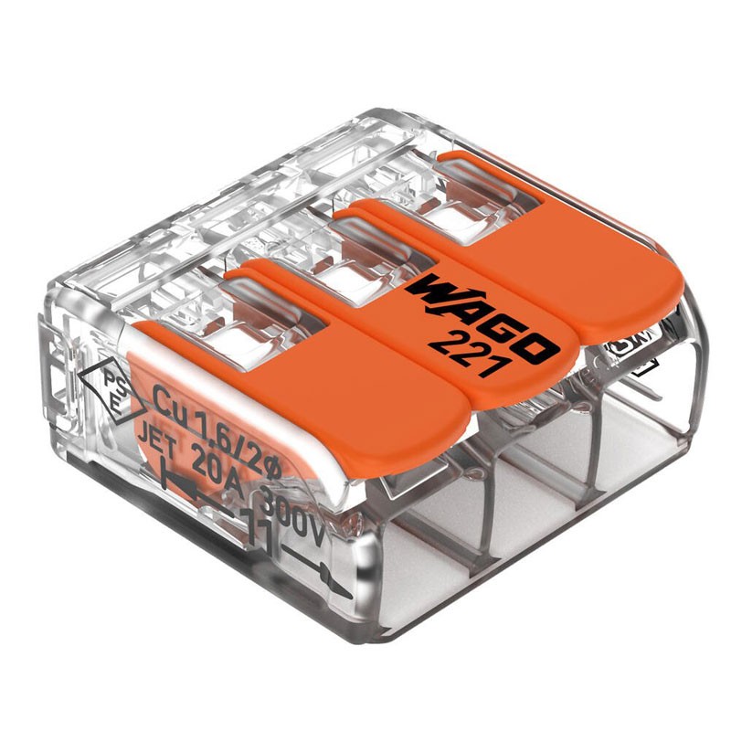 Les bornes WAGO Série 221 sont parmi les plus appréciées pour leur simplicité d'utilisation et la sécurité de la connexion. Les leviers ergonomiques permettent l'ouverture de la borne sans outils, tandis que la transparence du corps permet de vérifier visuellement la bonne insertion du conducteur.