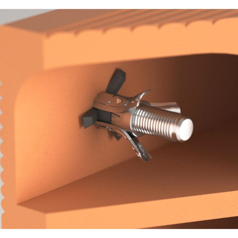 - En cas d'ancrage sur des matériaux perforés, l'expansion modulaire ou l'ouverture totale des ailettes en polymère permet un ancrage stable et sûr dans les cavités, tandis que l'expansion souple et guidée des ailettes métalliques d'épaisseur calibrée n'endommage pas les septums internes des briques.