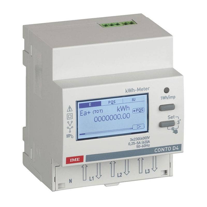 Compteur d'énergie Ime, 63 ampères, à impulsions 4 modules, triphasé, affichage graphique à 9 chiffres.