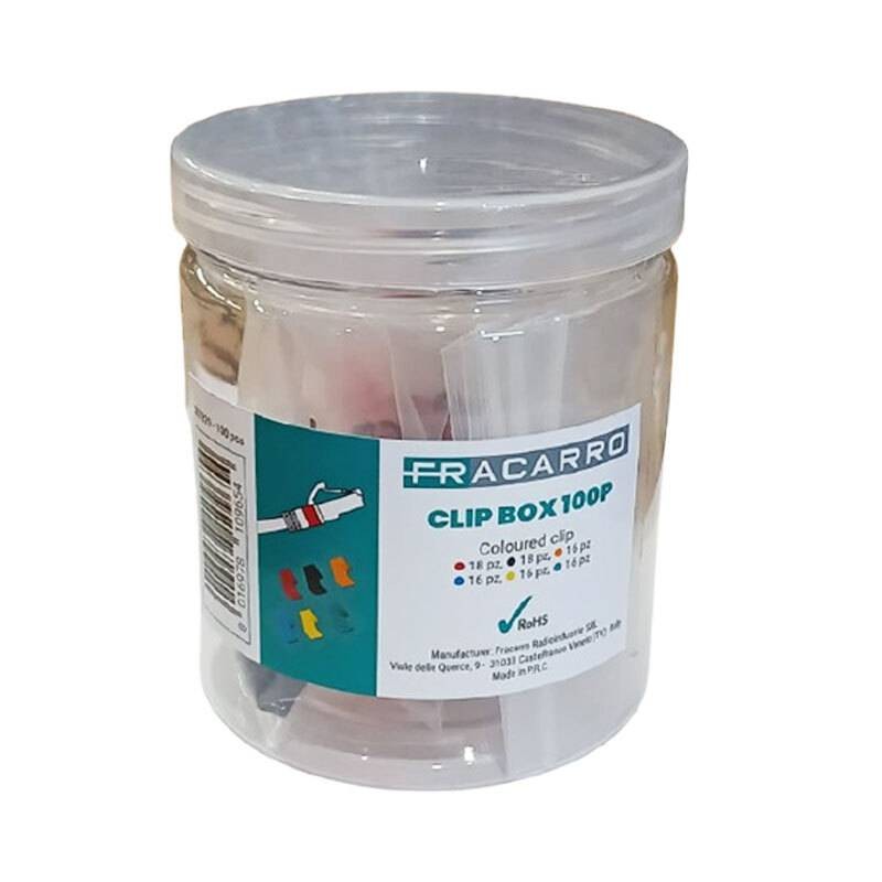 Clip Box colorées Fracarro pour cordons RJ45 en boîtes de 100 pièces, interchangeables pour une identification visuelle facile des câbles de réseau. Idéales pour une organisation ordonnée dans les environnements professionnels.