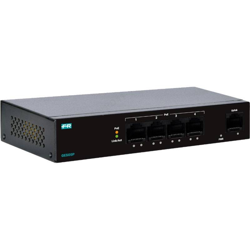 Fracarro GES05P (287866) est un switch Gigabit non géré avec 4 ports PoE+ et 1 uplink : alimente des caméras IP, AP et VoIP via Ethernet, est plug & play avec auto MDI/MDIX et boîtier métallique dissipant pour une fiabilité 24h/24.