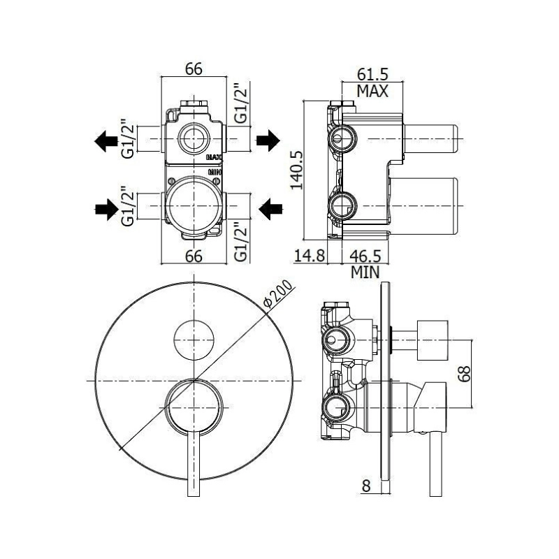 Mitigeur de douche encastré au design sophistiqué et pratique. Le produit est fourni avec une plaque métallique ronde de 200 mm. Les raccords standard 1/2 "G garantissent une utilisation facile et une compatibilité d'installation avec tous les types de systèmes.