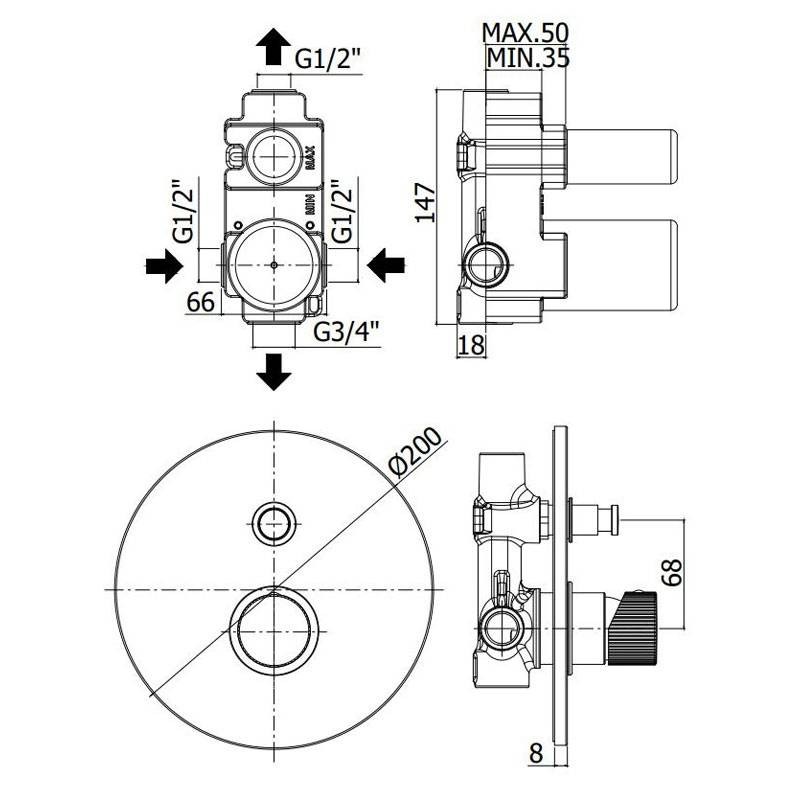 Mitigeur encastré pour douche Paffoni Jo 2 sorties chromé avec les caractéristiques suivantes :