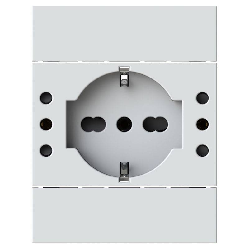 Prise 4Box P503 compatible avec la série Bticino LivingNow Blanc composée de 1 schuko, 2 prises 10A et 1 prise 10/16A.