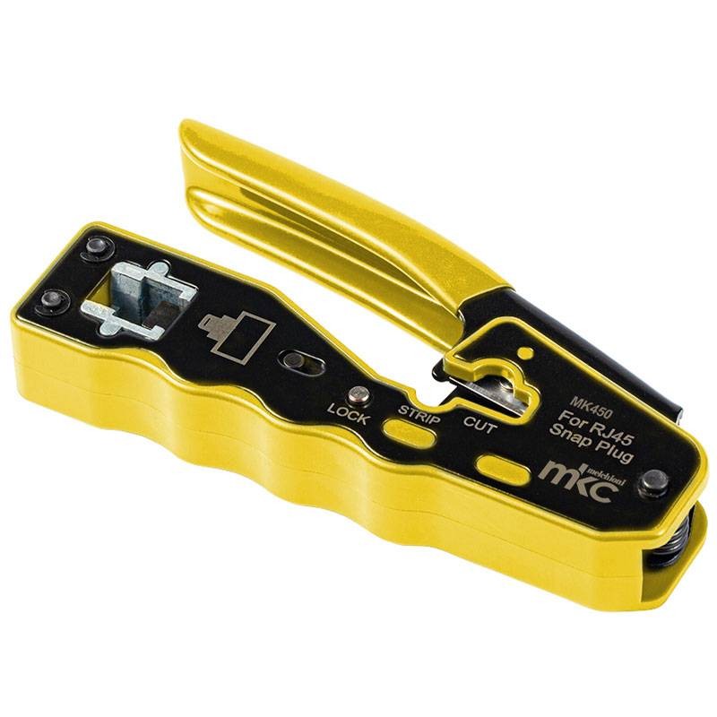 La pince à sertir Melchioni MK450 compacte avec technologie RJ45 traversante 8P est l'outil tout-en-un pour des câblages rapides : coupe, dénude et sertit Cat5e/Cat6/Cat6a (UTP/FTP) avec une prise ergonomique et une maniabilité maximale.