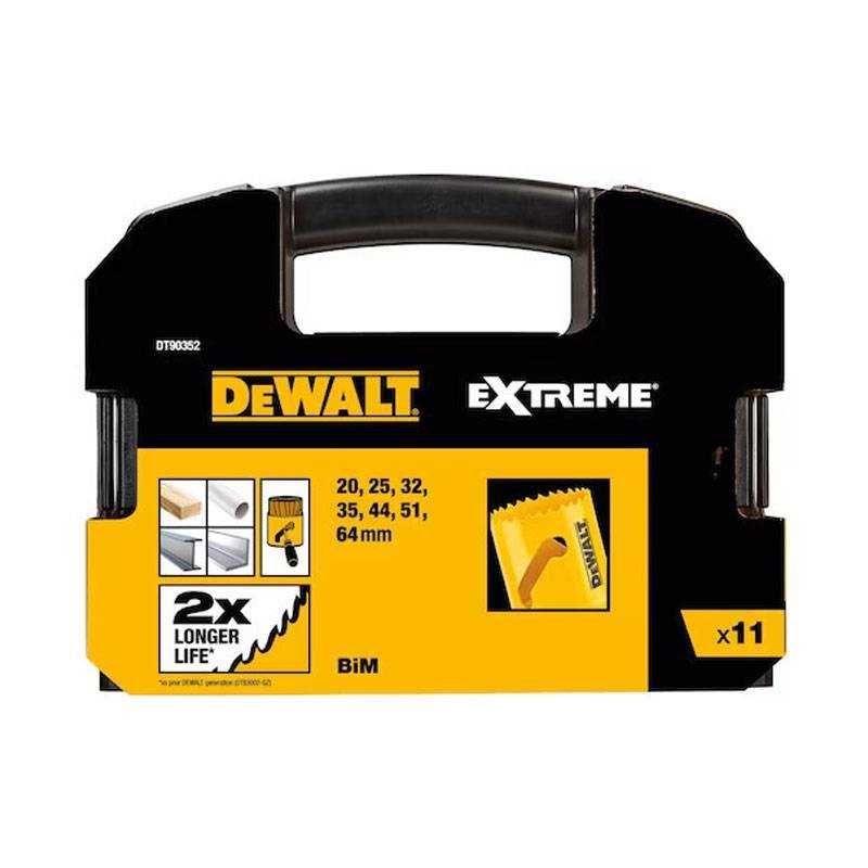 Set DeWalt DT90352QZ set : 11 scies cloches bimétalliques pour électriciens, kit complet avec mandrins et embouts. Coupe ultra profonde dans le bois, le métal, le plastique, jusqu'à 2 fois plus rapide avec une extraction rapide du matériau.