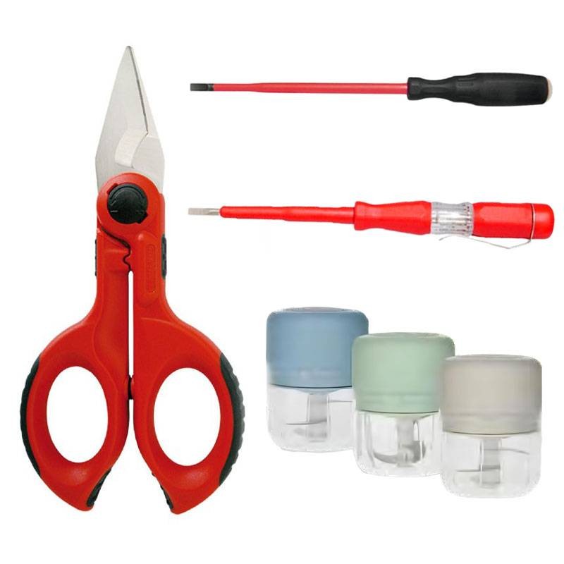 Kit Intercable Ciseaux dénudeurs et coupe-câbles Tournevis Slim Testeur de phase et Hachoir AO2508