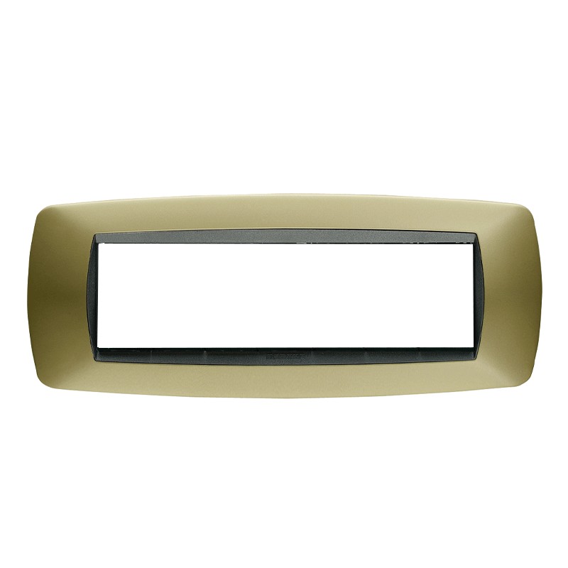 Plaque Master Modo 7 modules (fruits, lieux) couleur laiton opaque. La plaque se monte sur les supports 38007, 38007-F, ou par l'intermédiaire de l'adaptateur 39037 la plaque est compatible avec les supports LN4707 et L4707 des séries Bticino Living et LivingLight.