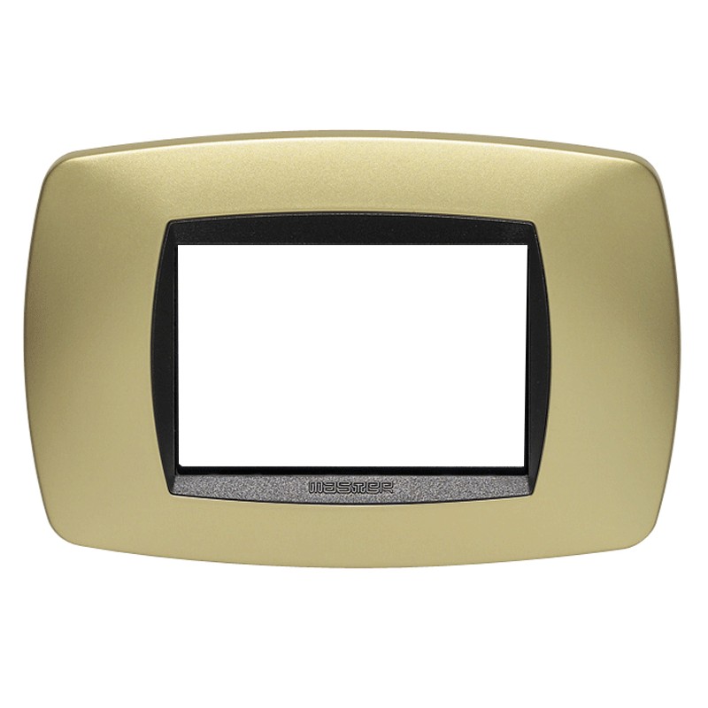 Plaque rectangulaire Master Modo 3 modules (fruits, lieux) en technopolymère, couleur or mat. La plaque se monte sur les supports 38003, 38003-F, ou par l'intermédiaire de l'adaptateur 39033 la plaque est compatible avec les supports LN4703 et L4703 Bticino Living series et LivingLight.