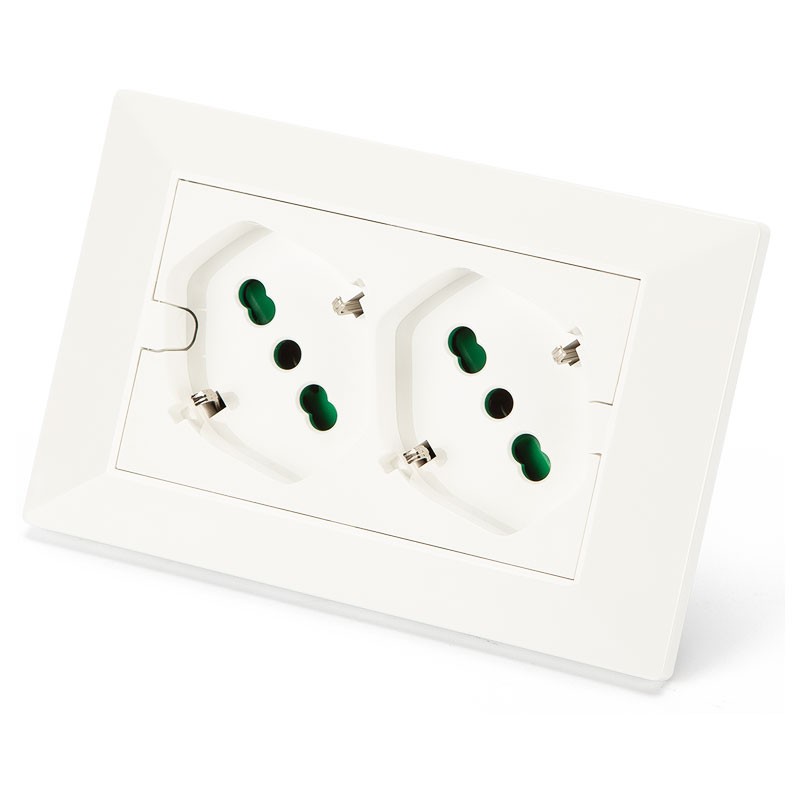 Multiprise encastrée Fanton Opera avec 2 prises bipas italo/allemandes 2P+E 16A, 3 Modules, montage direct sur la boîte (exemple 503E) à encastrement sans utiliser les supports, la plaque est fixée à l'encastrement sans ajouter d'autres accessoires. Couleur blanc.