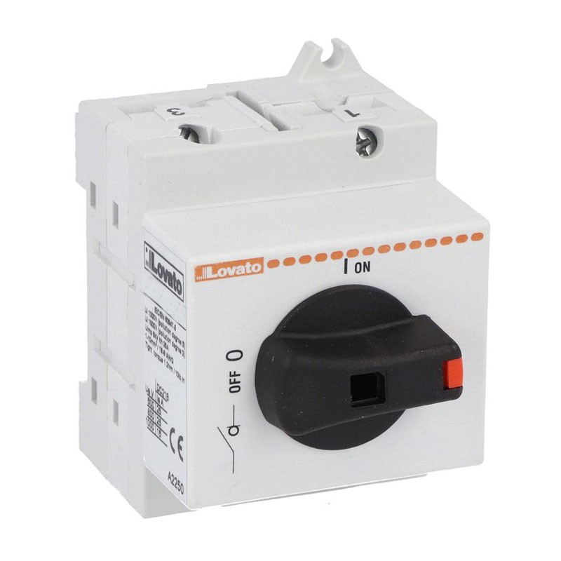 Interrupteur-sectionneur Lovato, Tension de service type DC, Courant thermique conventionnel à l'air libre Ith IEC 25A, Tension assignée d'isolement IEC/EN 1000V, version à commande directe, avec poignée pour photovoltaïque, 3 pôles.