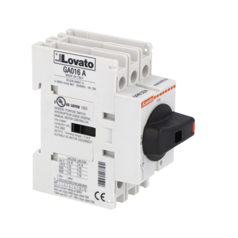 Sectionneur à trois pôles Lovato 16A rail Din exécution directe d'une commande complète avec poignée noire, pour l'exécution de serrure de porte complète avec l'extension et la poignée GA016A