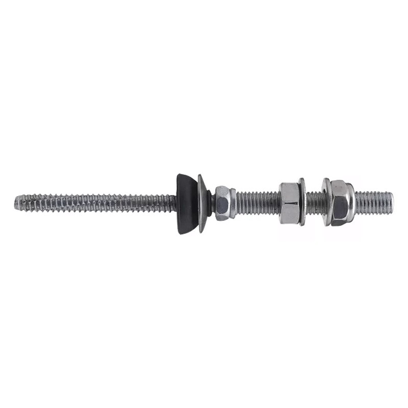 Vis à double filetage Fischer pour installations photovoltaïques M10x181mm, sur toiture en tôle ondulée et structure porteuse en acier.