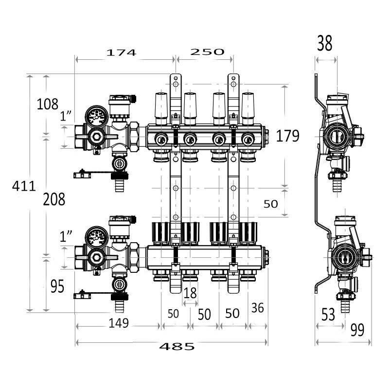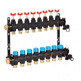 Le collecteur de retour comprend des vannes avec volant manuel, amovibles pour l'installation d'actionneurs électrothermiques Giacomini R478, R478M, R473, R473M compatibles, pour un contrôle intelligent des circuits et de la température.