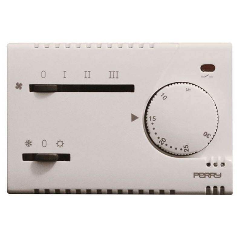 Thermostat électronique Perry pour ventilo-convecteurs, conçu pour un contrôle précis de la température et une gestion efficace de la vitesse. Compatible avec différentes séries de plaques ABB, BTicino, Gewiss et Vimar, avec les caractéristiques suivantes :