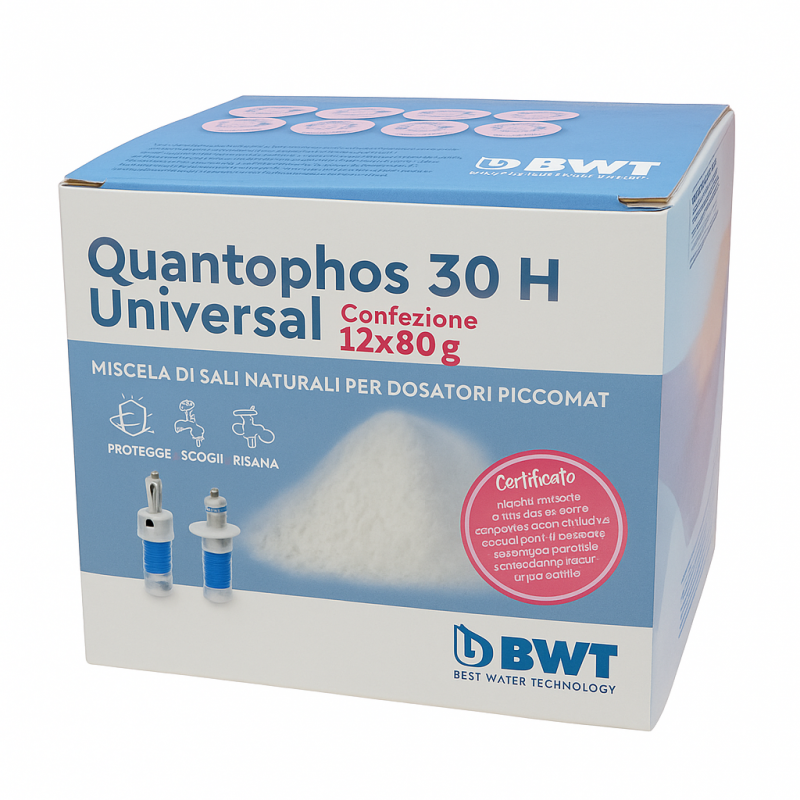 Polyphosphates en poudre BWT Quantophos 30 H, de qualité alimentaire pour les distributeurs proportionnels Piccomat. Prévient l'entartrage et la corrosion, avec les caractéristiques suivantes :