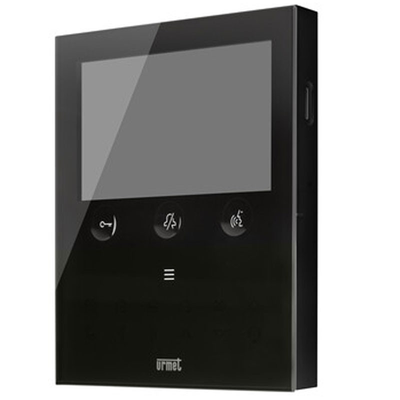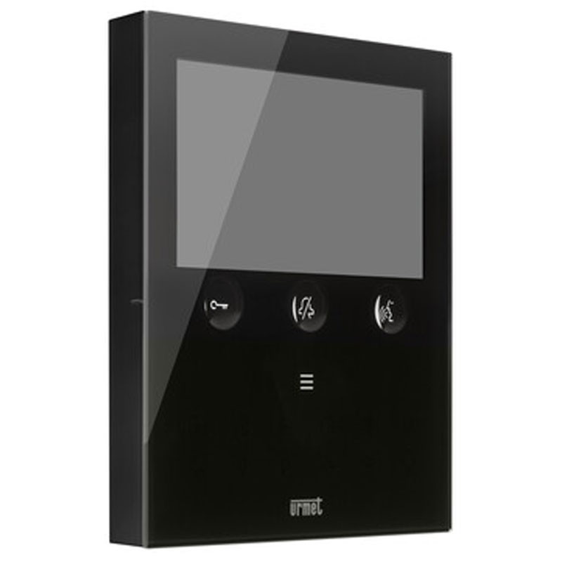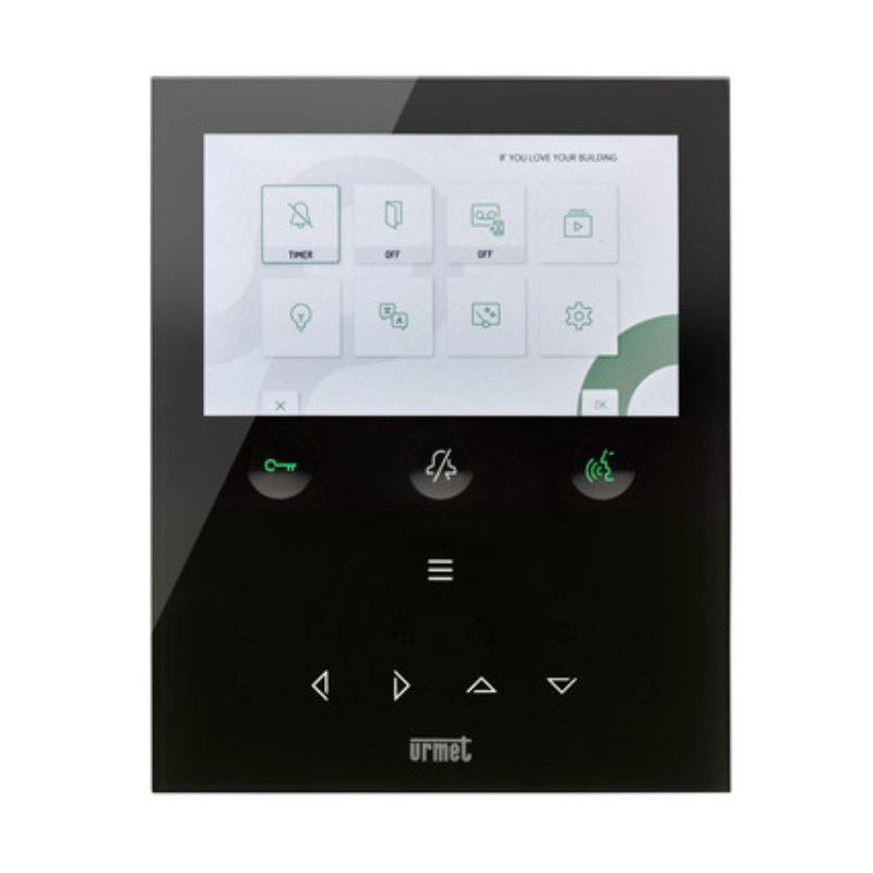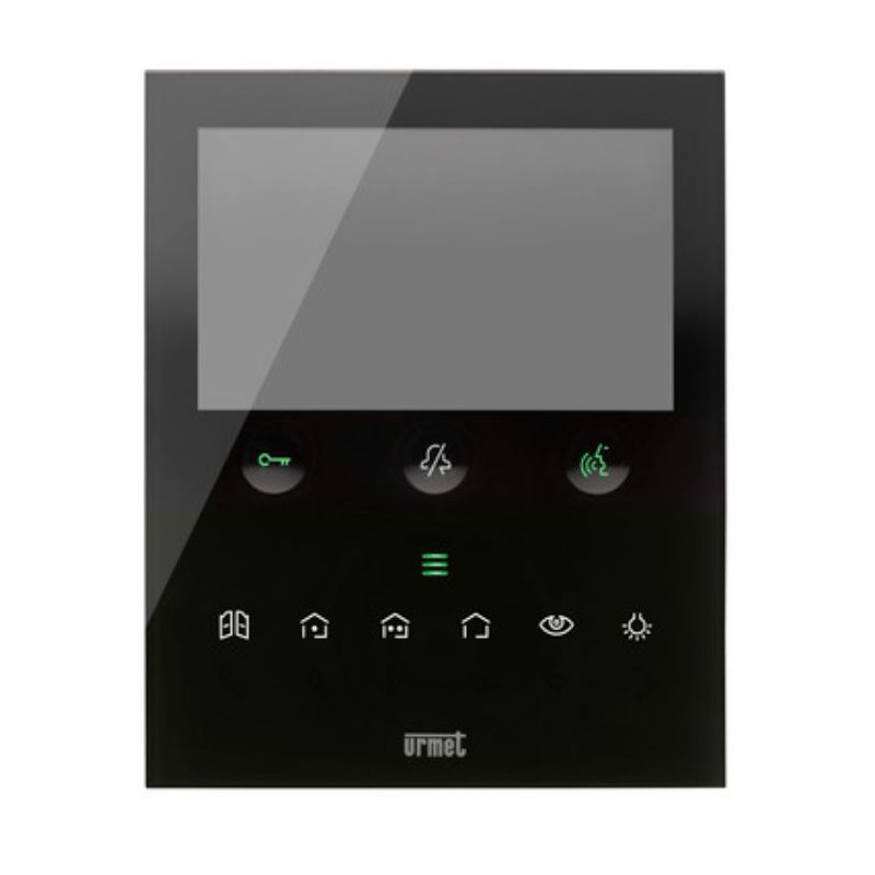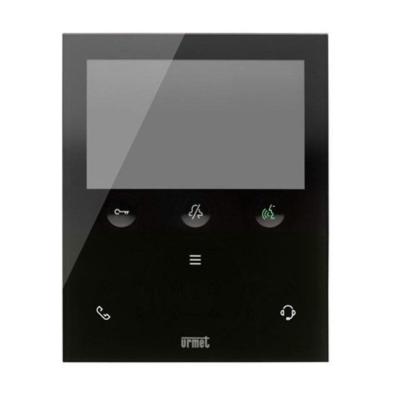 Urmet VOG5W 1760/15U est le vidéophone mains libres 2Voice de 5" en verre noir avec Wi-Fi 2,4 GHz : transfère l'appel sur smartphone, prend en charge les commandes vocales/Alexa et les gestes "sans contact" avec capteur IR.