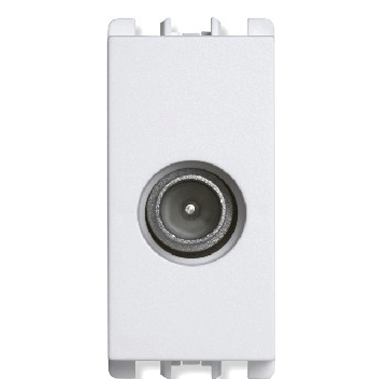 Prise TV-SAT directe Urmet Simon Nea, fréquence 5-2400 MHz, connecteur IEC mâle diamètre 9,5 mm / IEC 169-2, atténuation 0,5 dB, 1 module, blanc. Permet le passage du courant continu et des signaux de commande (24V-500mA max). À appliquer sur les supports 10702N.G,10703N,10704N,10706N,10707.