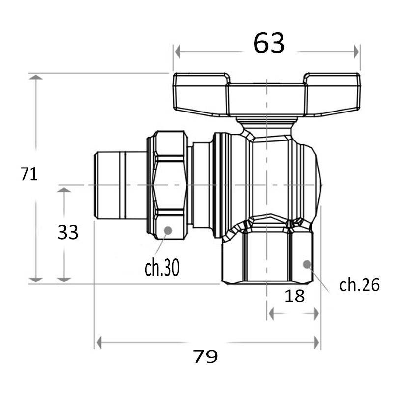 Vanne équerre à bille Giacomini avec poignée papillon, passage intégral. Pour l'eau, les gaz non dangereux et les hydrocarbures liquides, avec les caractéristiques suivantes :